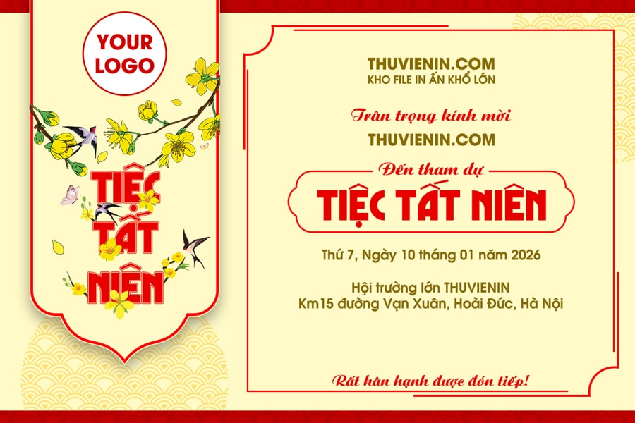Mẫu file thiết kế thiệp mời Tiệc Tất Niên thiết kế truyền thống với tông vàng đỏ nổi bật, họa tiết hoa mai và chim én may mắn. Phù hợp mời tiệc cuối năm công ty, gia đình, đối tác.