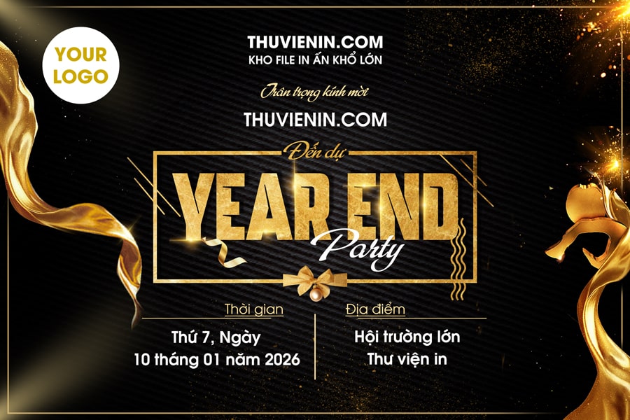 Mẫu file PSD thiệp mời Year End Party thiết kế sang trọng với tông đen vàng ánh kim nổi bật, phong cách hiện đại và chuyên nghiệp.
