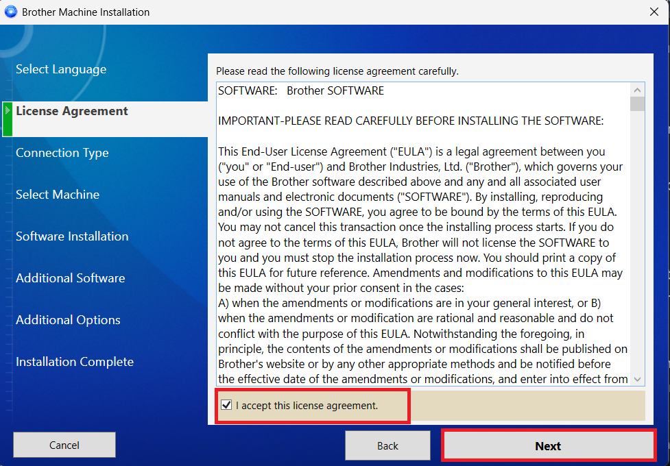 Chấp nhận điều khoản: Nhấn Yes để đồng ý với các điều khoản sử dụng của Brother và tiếp tục.