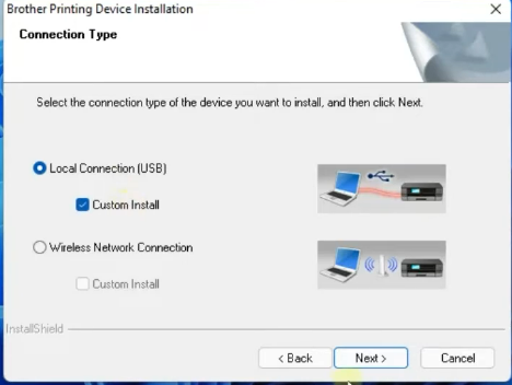 Lựa chọn kiểu kết nối: Tại màn hình chọn kiểu kết nối, bạn chọn dòng Local Connection (USB) để cài đặt qua dây cáp tín hiệu, sau đó nhấn Next.