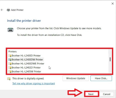 Một danh sách các thiết bị sẽ hiện ra. Bạn hãy thực hiện thao tác cuộn để tìm và chọn đúng kiểu máy in (model) mà bạn đang sở hữu, sau đó nhấn Next.