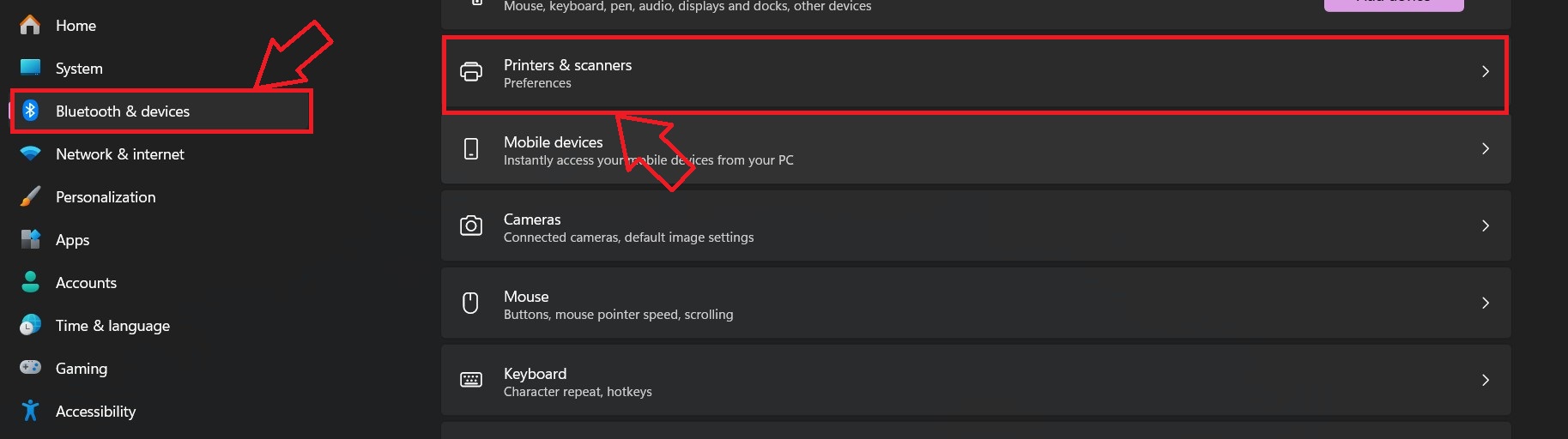 Truy cập quản lý thiết bị: Vào menu Settings, chọn mục Bluetooth & devices, sau đó tìm đến phần Printers & scanners.